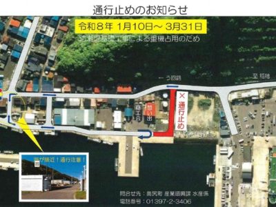 令和8年1月10日~3月31日の間、道々奥尻島線から商工会前までの港湾道路の一部が、工事のため通行止めとなります。